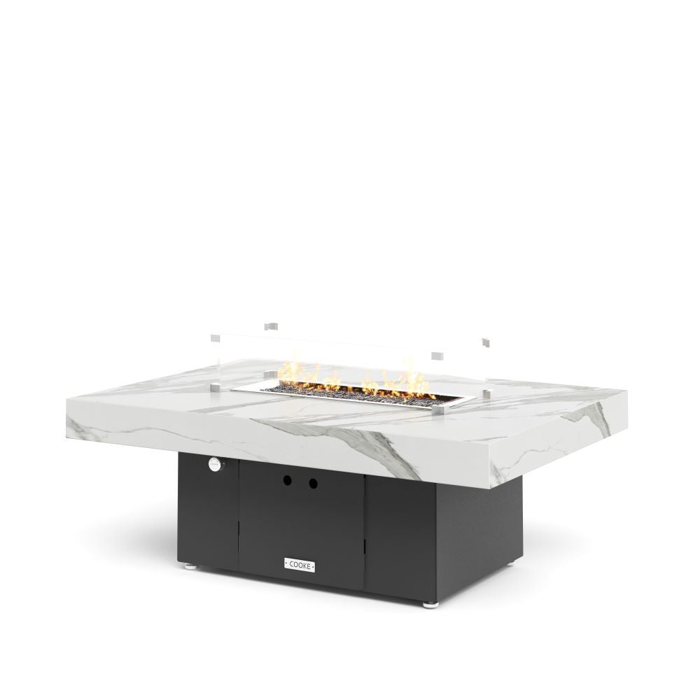 This Santa Barbara outdoor fire pit table features a white marble porcelain table top made from engineered porcelain so you get all the beauty of marble with the durability of porcelain. This table features a solid, simple un-tapered base, thick table top. Perfect for your own courtyard, backyard, or garden sanctuary. Built with the same legendary Cooke durability, this table conveys and impression of permanence, tranquility, and comfort. Our customers love the stability on uneven surfaces, and plenty of room for small plates and drinks. Cover up the burner and this table is a stylish and functional garden table.