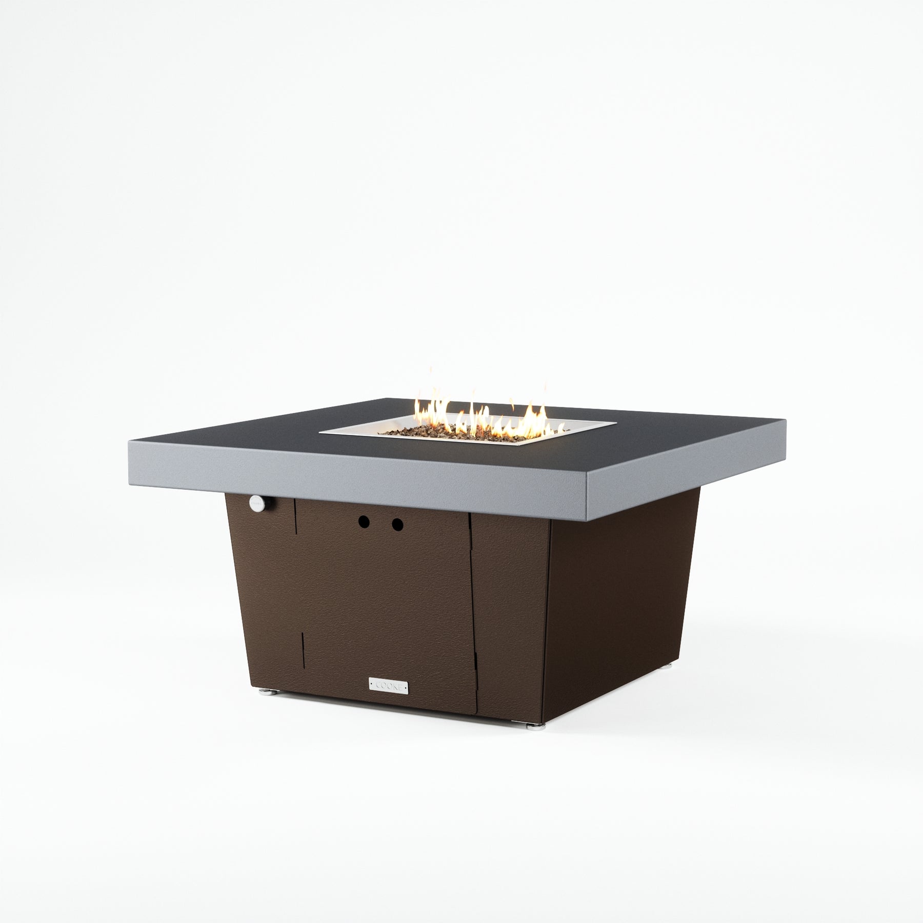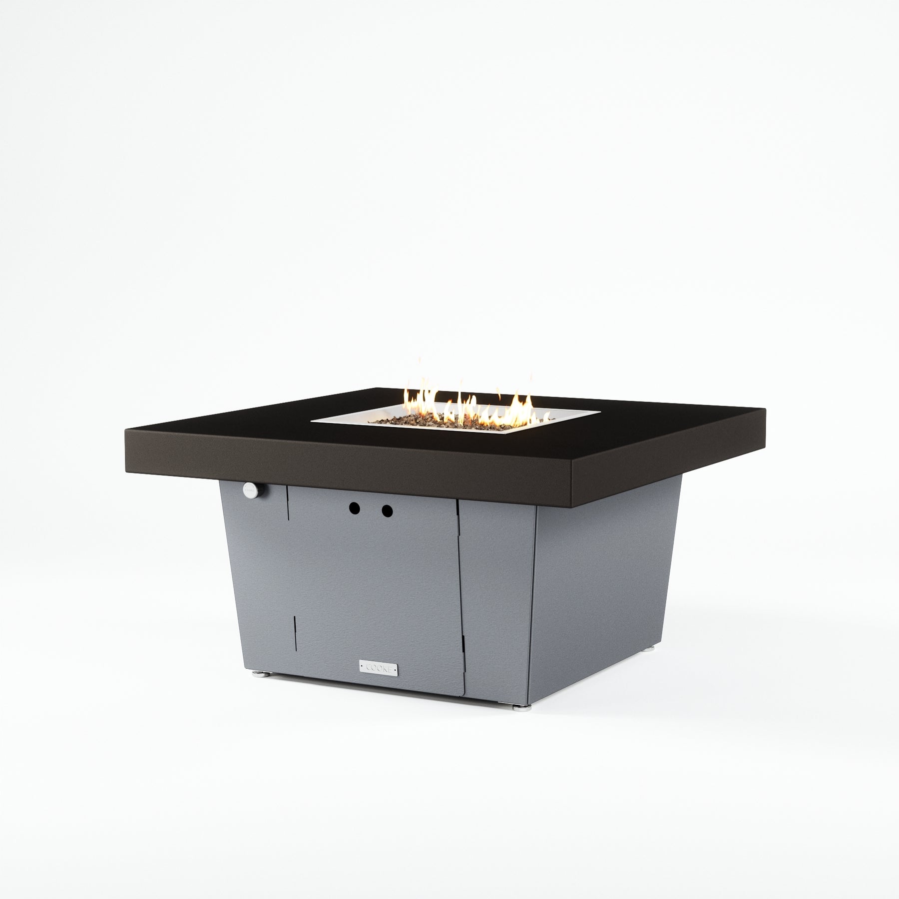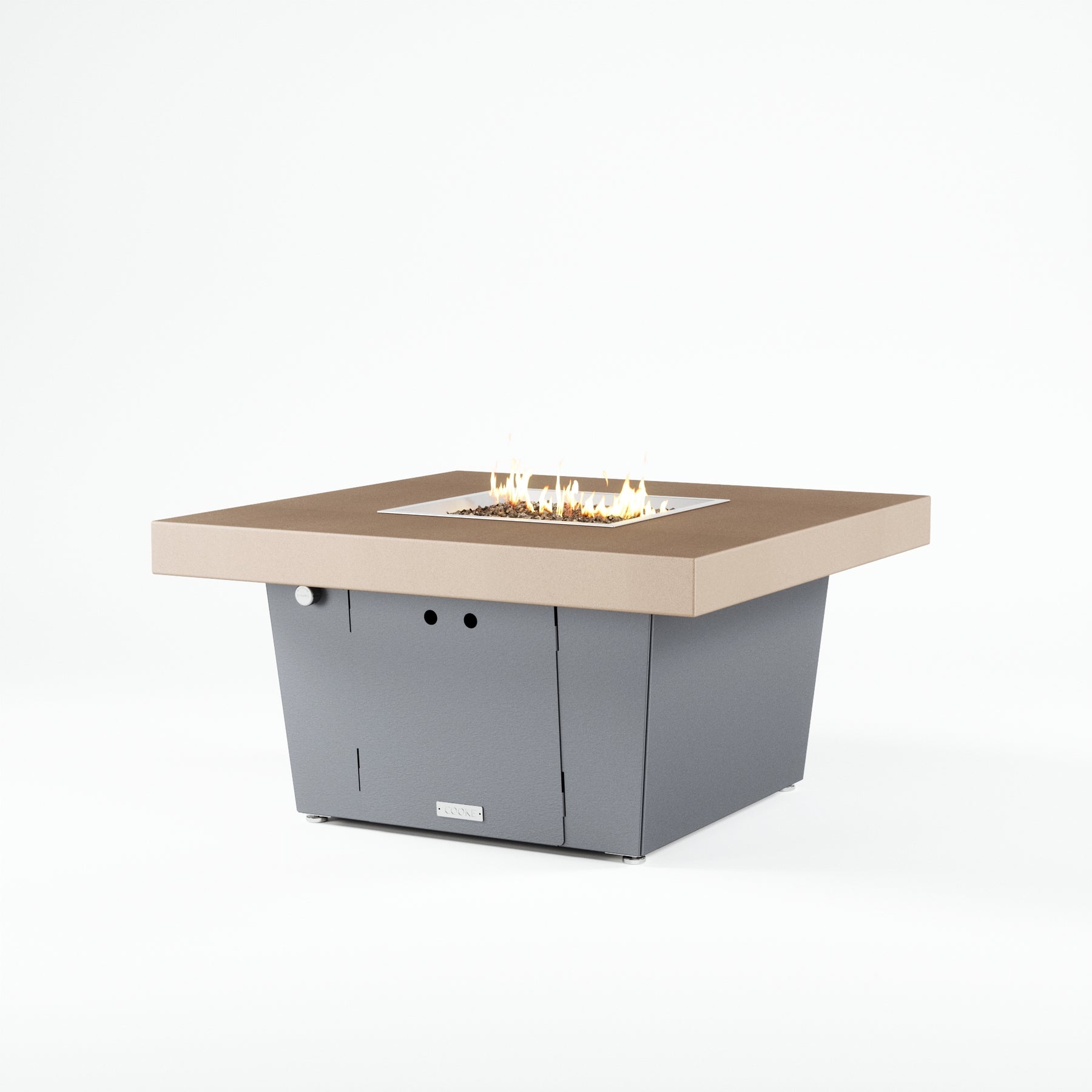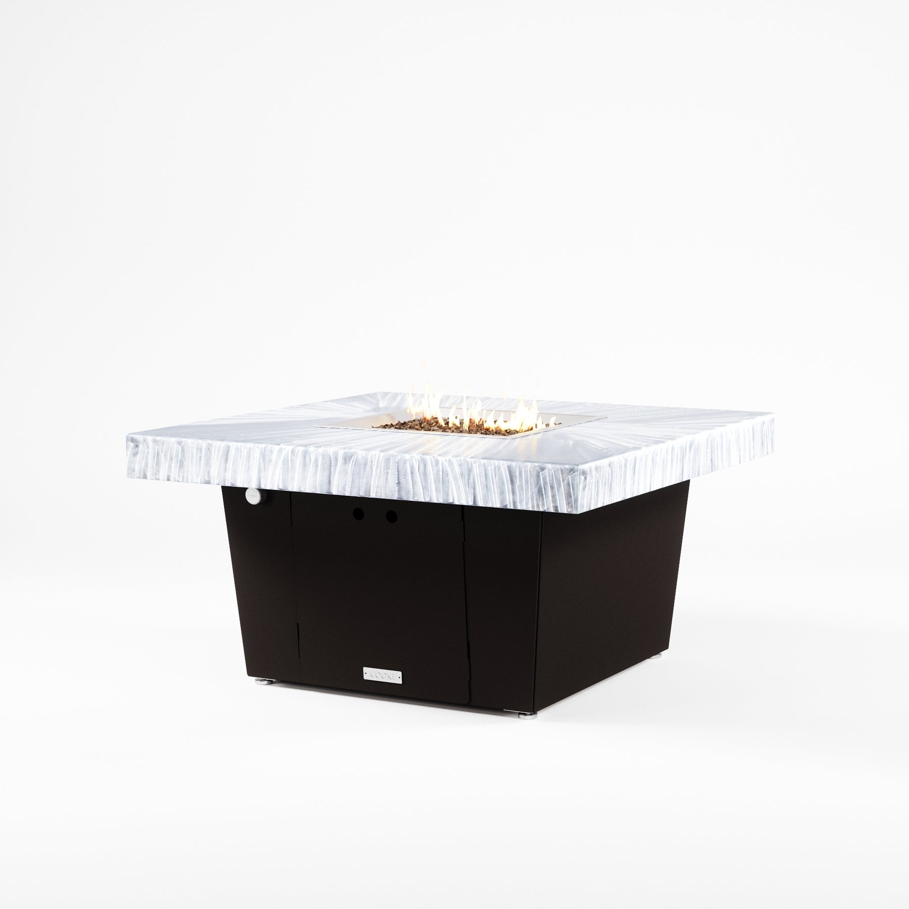 The Parkway fire pit table is COOKE's solution to a great-looking, quality, made-in-USA square fire pit table that is versatile and a great value. This chat height fire pit table features a generous table top with 4" edge on a 21" tall slightly tapered base. This table has elegant lines lines and a nice clean contemporary look that will continue to look fresh. This table is big enough for ample seating but is carefully designed to be integrated into landscaped lounge areas, open patio spaces with planters, or near fountains and water features. The COOKE Parkway is hands down the best value for an all aluminum fire pit table.