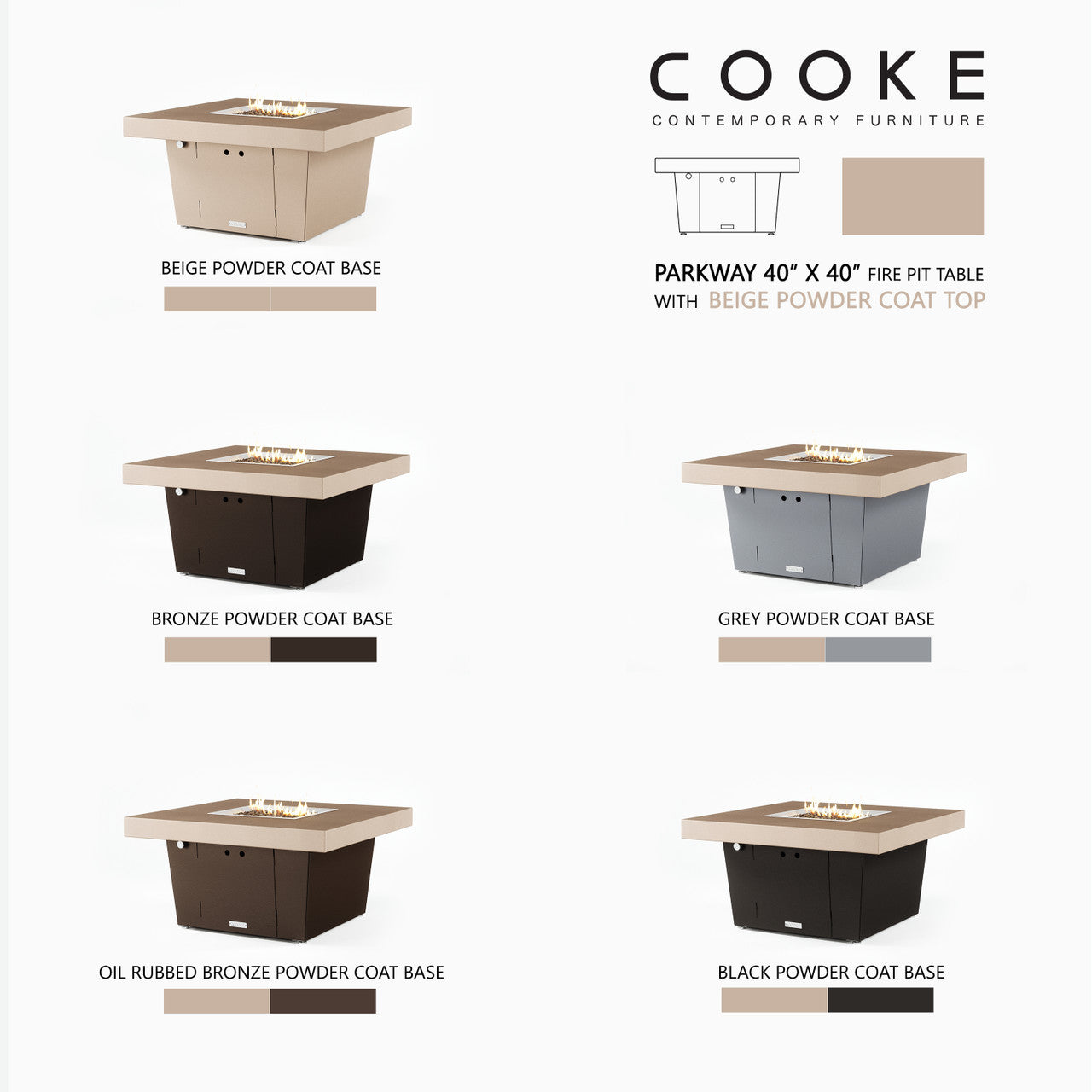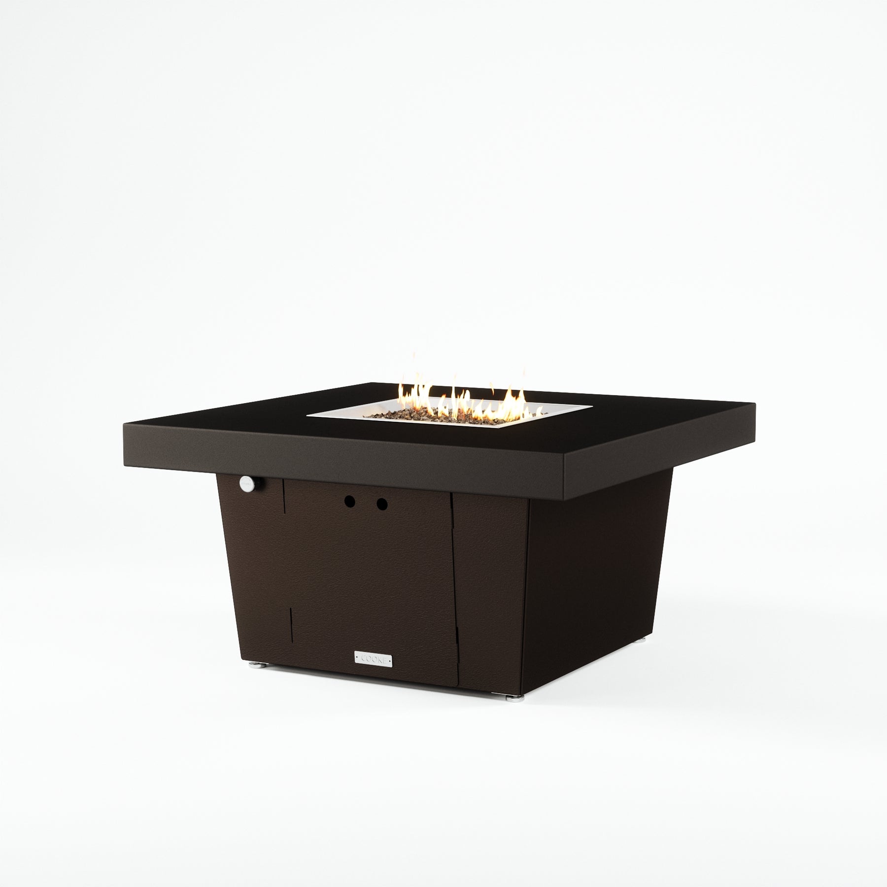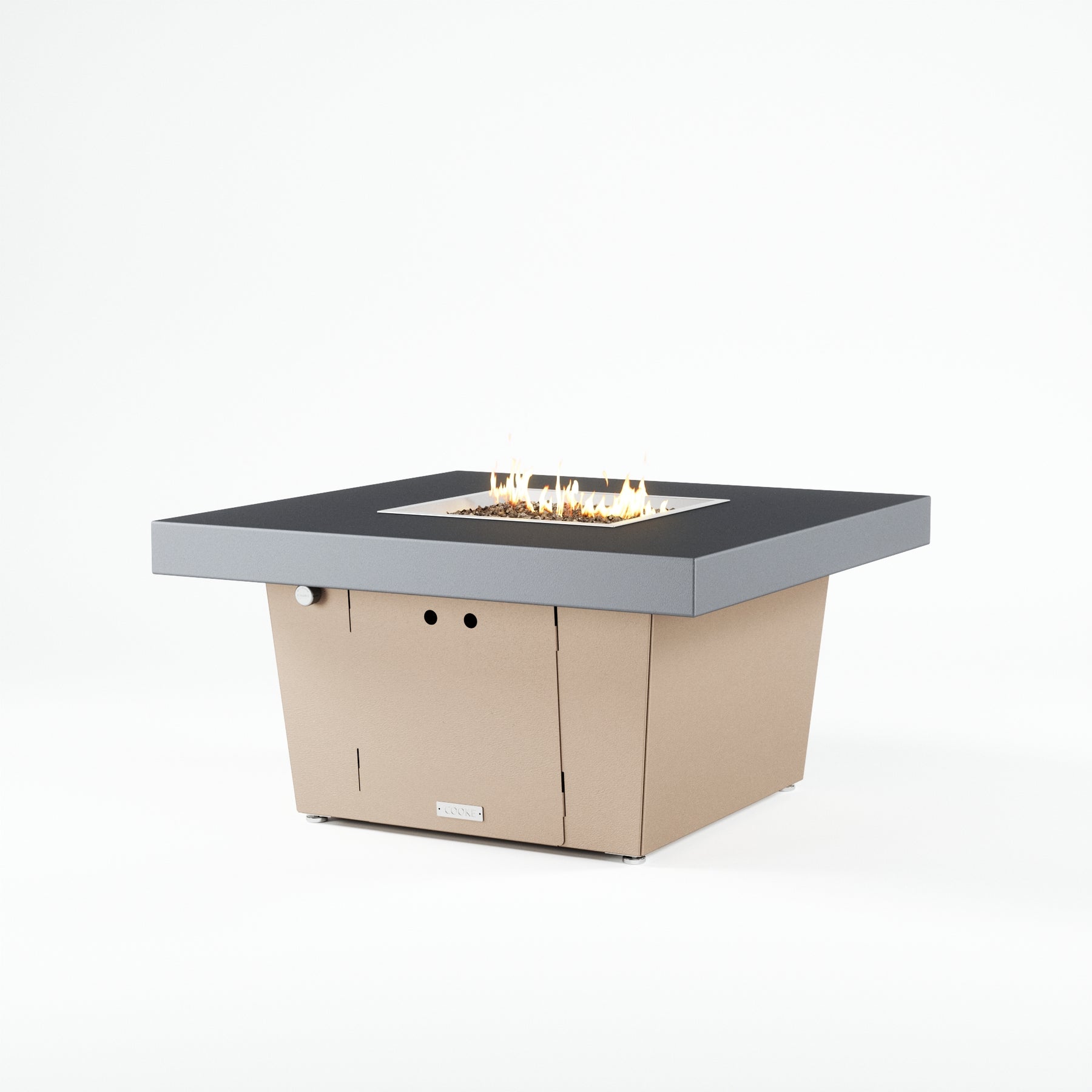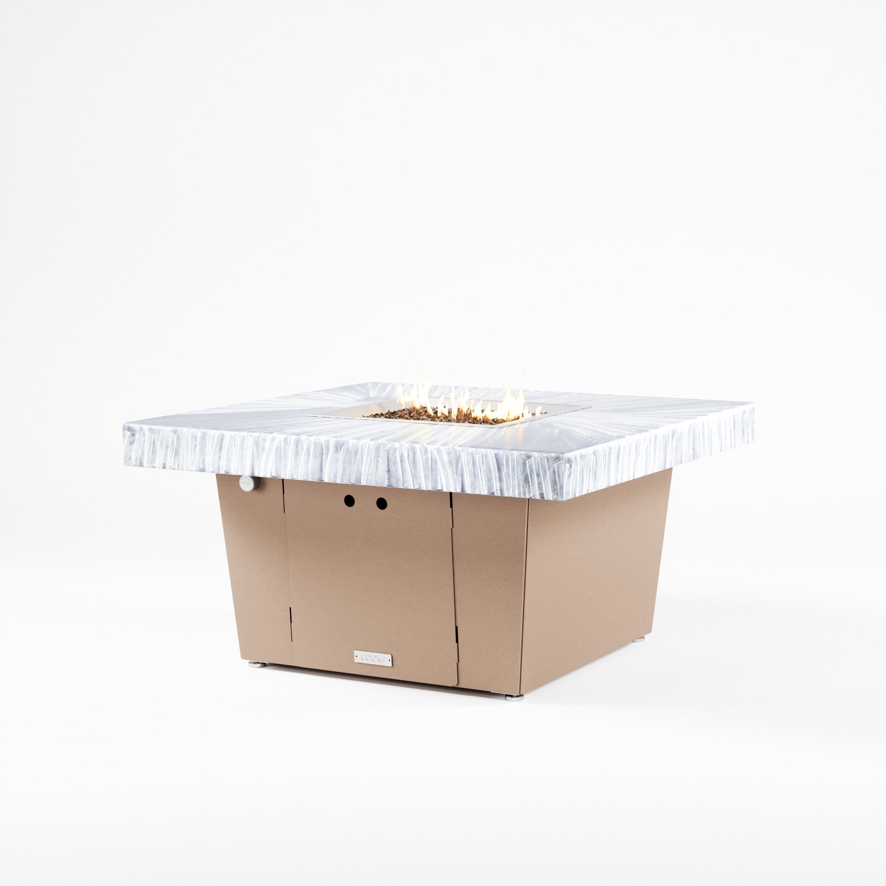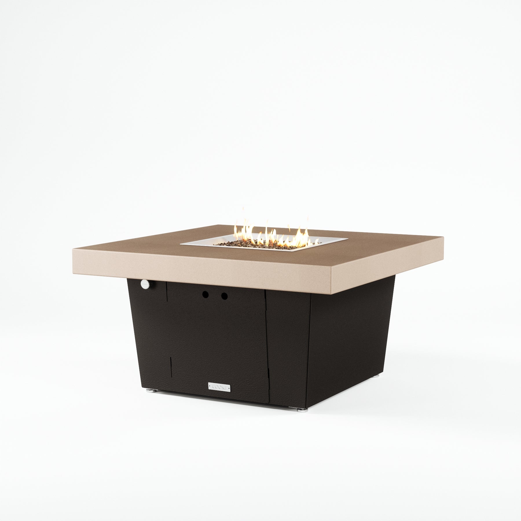 The Parkway fire pit table is COOKE's solution to a great-looking, quality, made-in-USA square fire pit table that is versatile and a great value. This chat height fire pit table features a generous table top with 4" edge on a 21" tall slightly tapered base. This table has elegant lines lines and a nice clean contemporary look that will continue to look fresh. This table is big enough for ample seating but is carefully designed to be integrated into landscaped lounge areas, open patio spaces with planters, or near fountains and water features. The COOKE Parkway is hands down the best value for an all aluminum fire pit table.