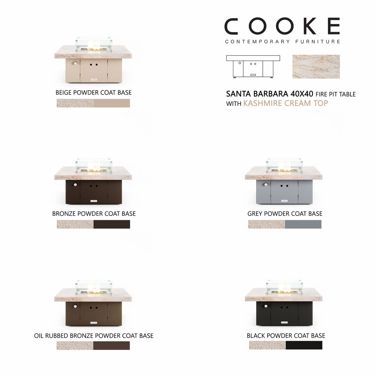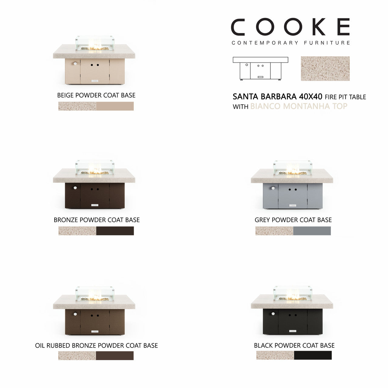 The Santa Barbara outdoor fire pit table is COOKE's contemporary lounge height table with oversized top. This impressive table features a solid, simple, straight sided block base and thick granite or aluminum table top. The Santa Barbara is available in a wide variety of color combinations - a perfect match for your own hardscaped backyard, pool areas, or outdoor living space. Built with the same legendary COOKE quality, this table conveys an impression of permanence, tranquility, and comfort.