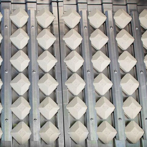 Eliminates hot and cold spots, making the effective grilling area 100% of the grilling surface. High-density composite material in a flat top pyramid-shape, with a heat-holding cavity underneath, delivers intense heat to the cooking surface. Radiant tray locks briquettes in place.