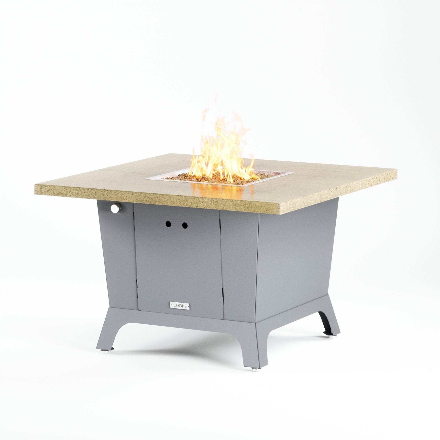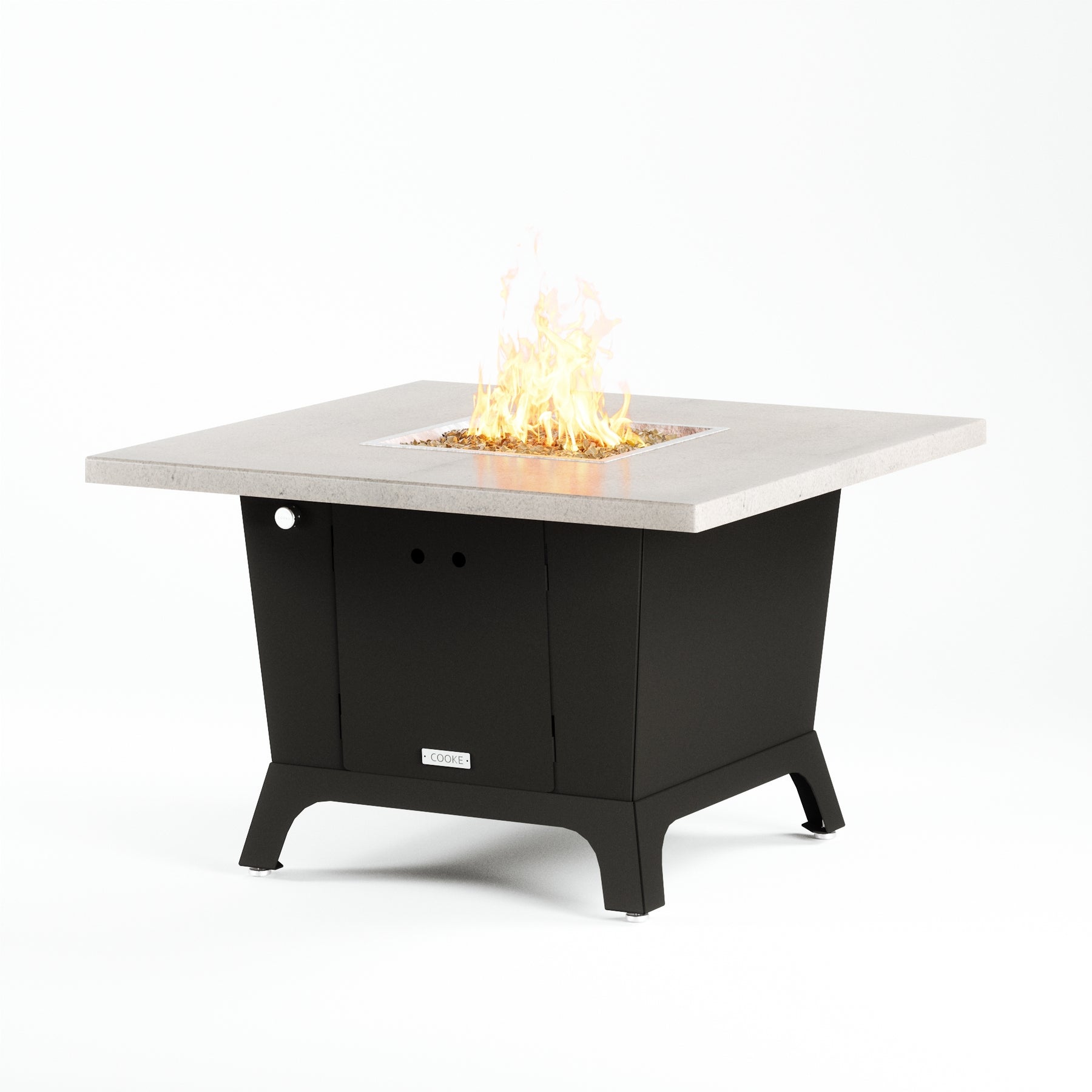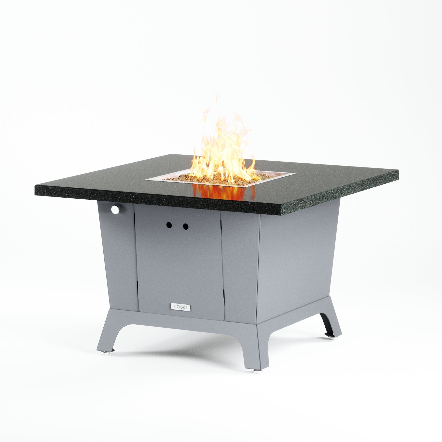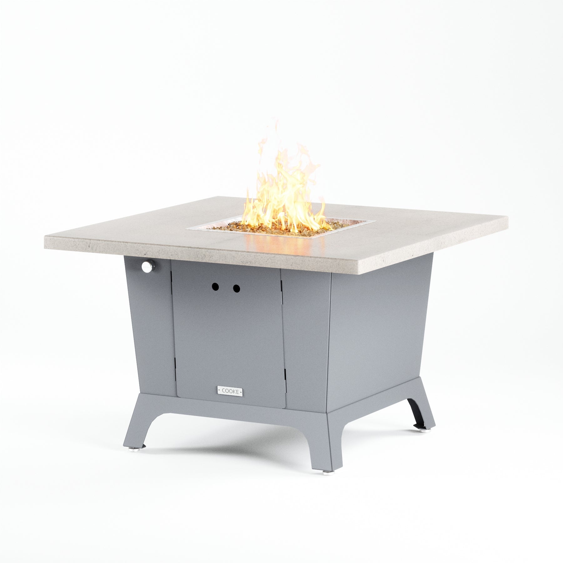 Dine under the stars with a COOKE Parkway fire pit table. The Parkway fire pit table is COOKE's solution to a great-looking, quality, made-in-USA square fire pit table that is versatile and a great value. This dining height fire pit table features a generous table top with 3cm edge on a 28" tall slightly tapered base. This table has lighter lines, a more traditional look, but a clean simplicity that will continue to look fresh. This table is big enough for ample seating but is carefully designed to be integrated into landscaped lounge areas, open patio spaces with planters, or near fountains and water features. The COOKE Parkway is hands down the best value for an all aluminum or real stone fire pit table.