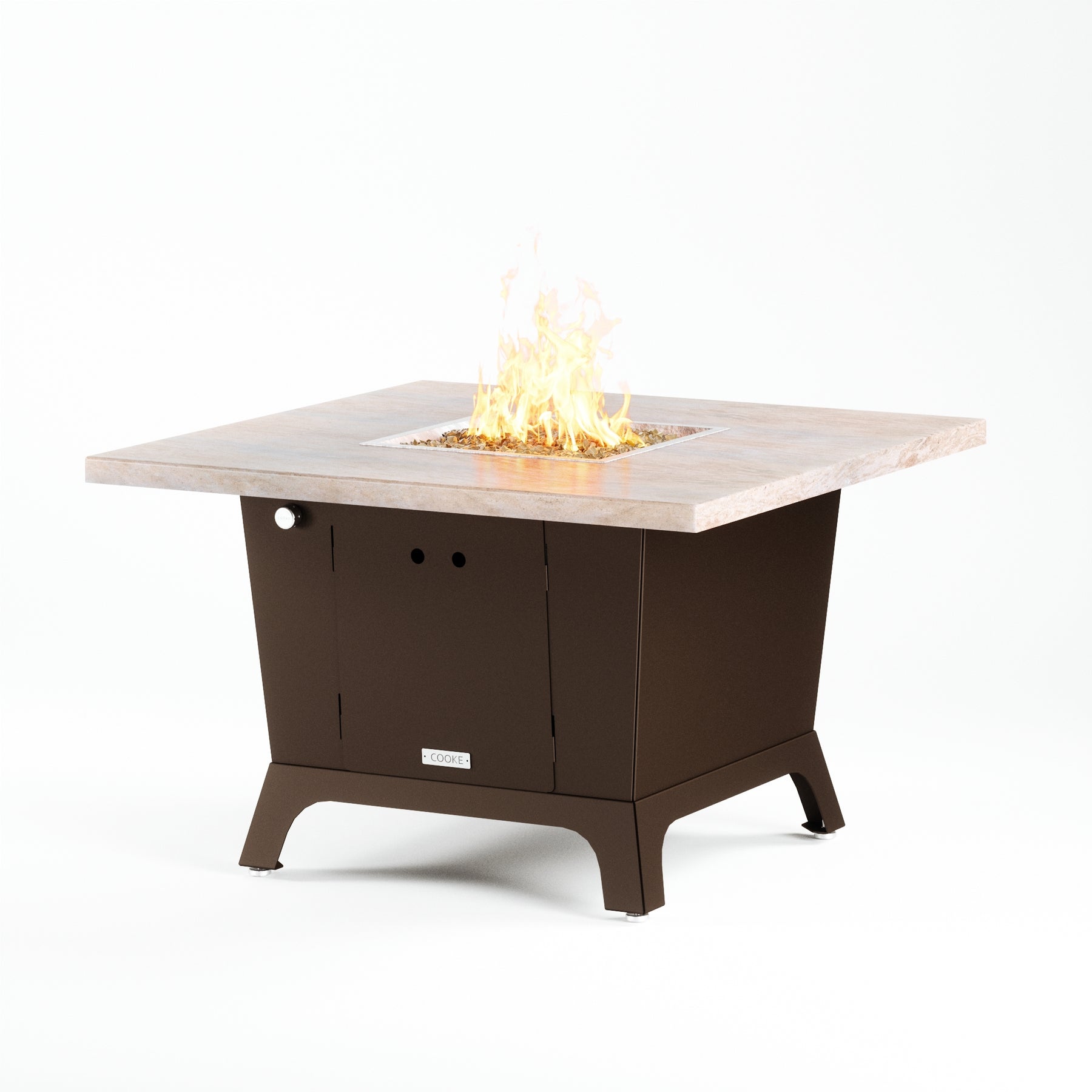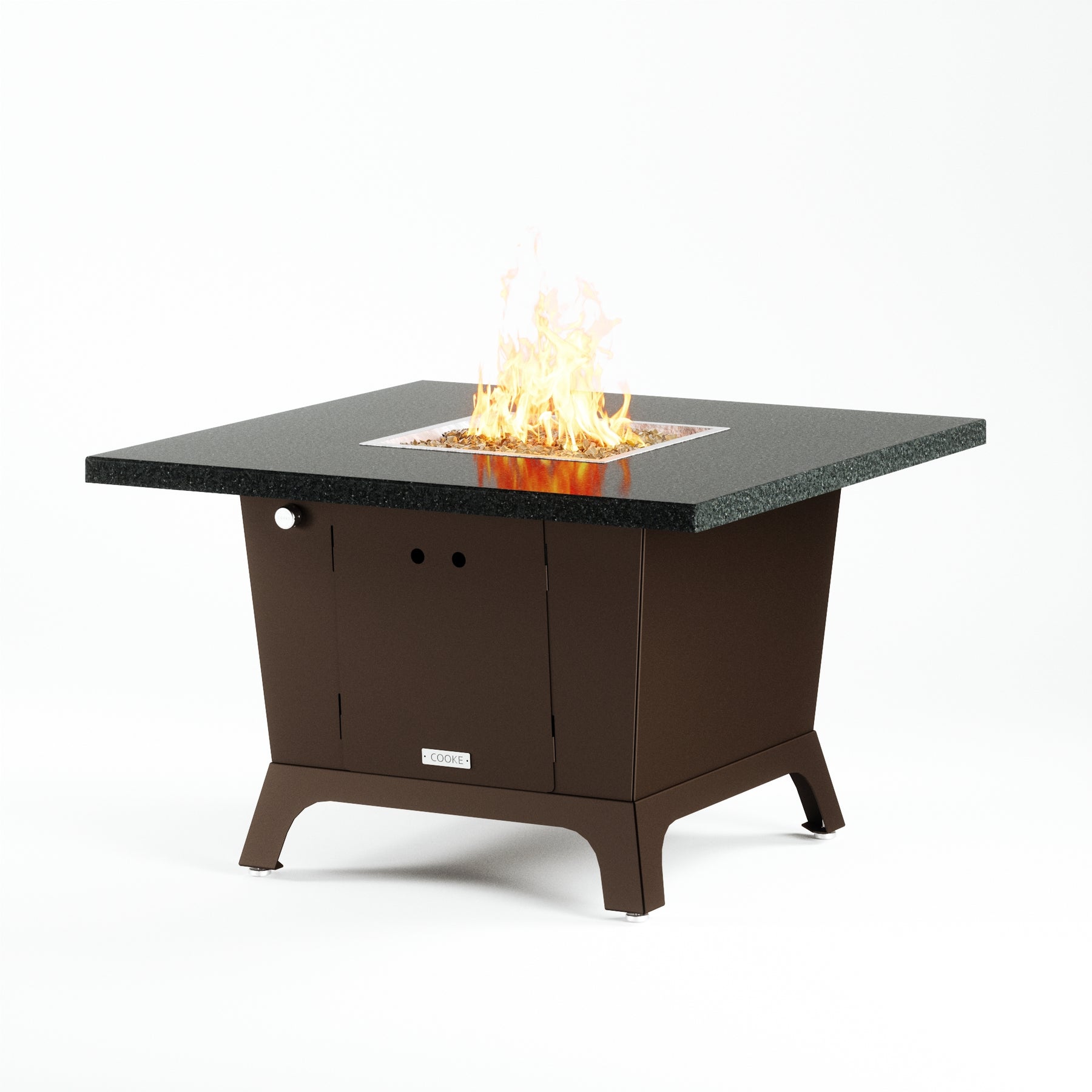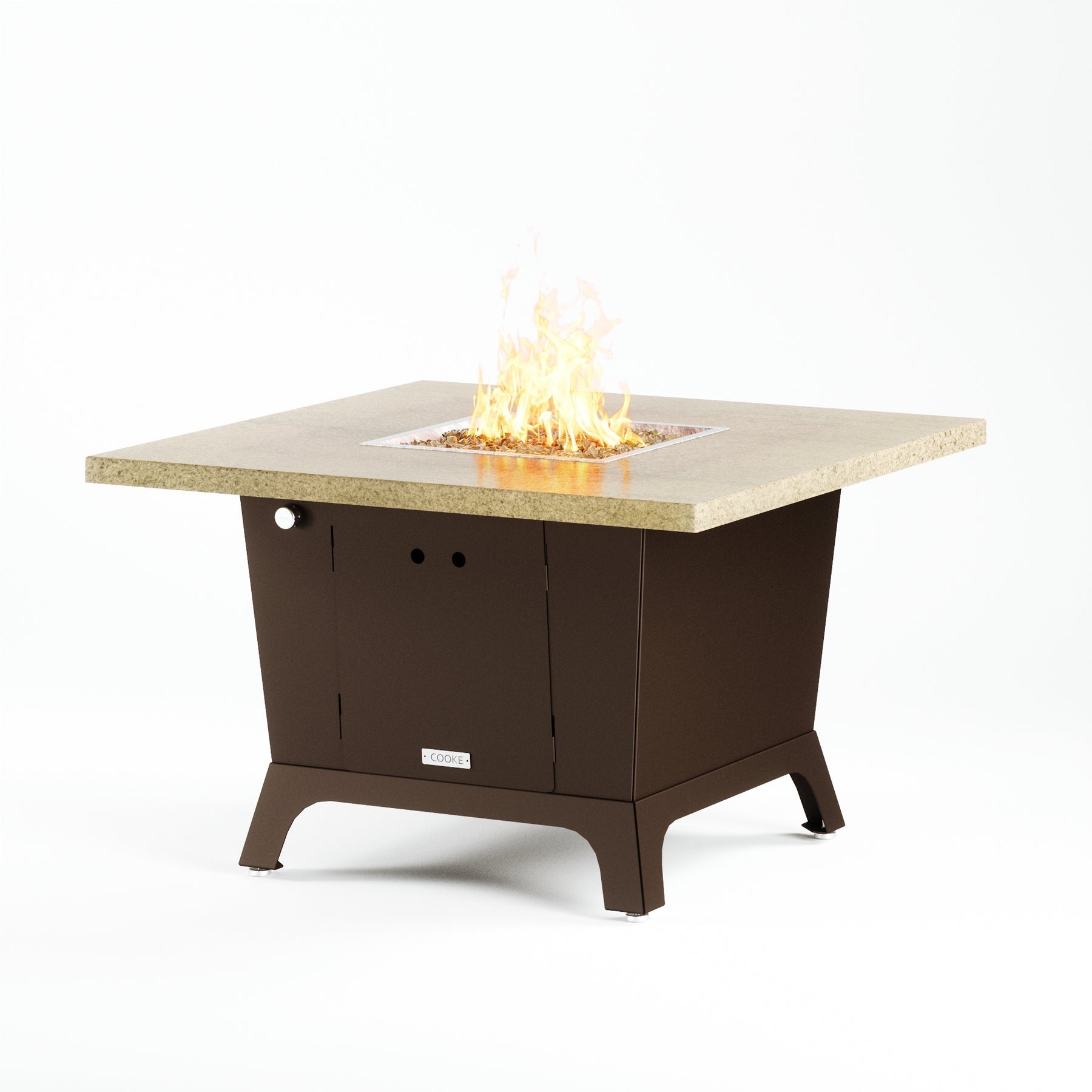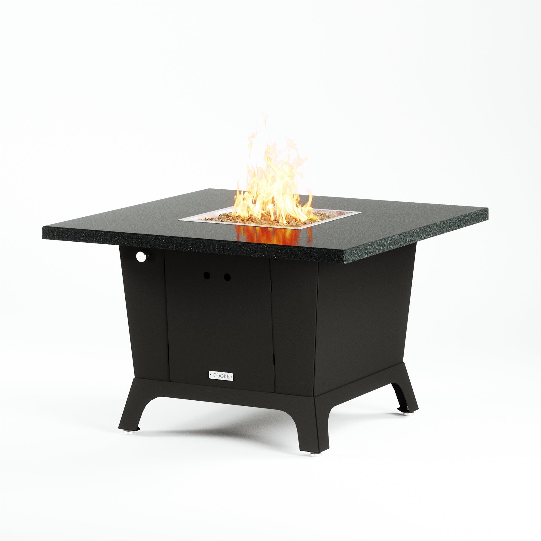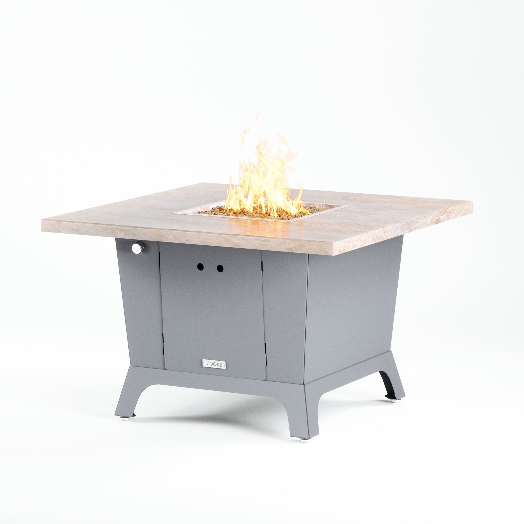Dine under the stars with a COOKE Parkway fire pit table. The Parkway fire pit table is COOKE's solution to a great-looking, quality, made-in-USA square fire pit table that is versatile and a great value. This dining height fire pit table features a generous table top with 3cm edge on a 28" tall slightly tapered base. This table has lighter lines, a more traditional look, but a clean simplicity that will continue to look fresh. This table is big enough for ample seating but is carefully designed to be integrated into landscaped lounge areas, open patio spaces with planters, or near fountains and water features. The COOKE Parkway is hands down the best value for an all aluminum or real stone fire pit table.