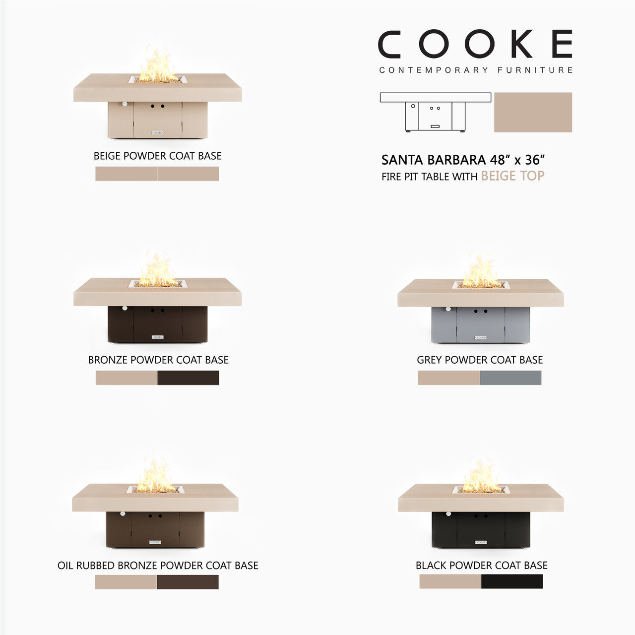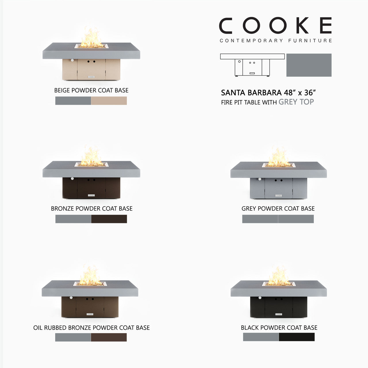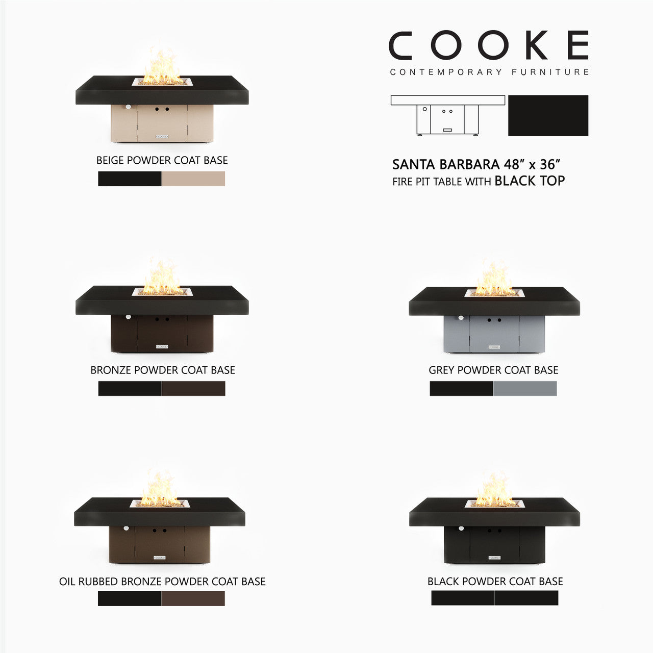 The Santa Barbara outdoor fire pit table is COOKE's contemporary lounge height table with oversized top. This impressive table features a solid, simple, straight sided block base and contemporary aluminum table top. The Santa Barbara is available in a wide variety of color combinations - a perfect match for your own hardscaped backyard, pool areas, or outdoor living space. Built with the same legendary COOKE quality, this table conveys an impression of permanence, tranquility, and comfort.