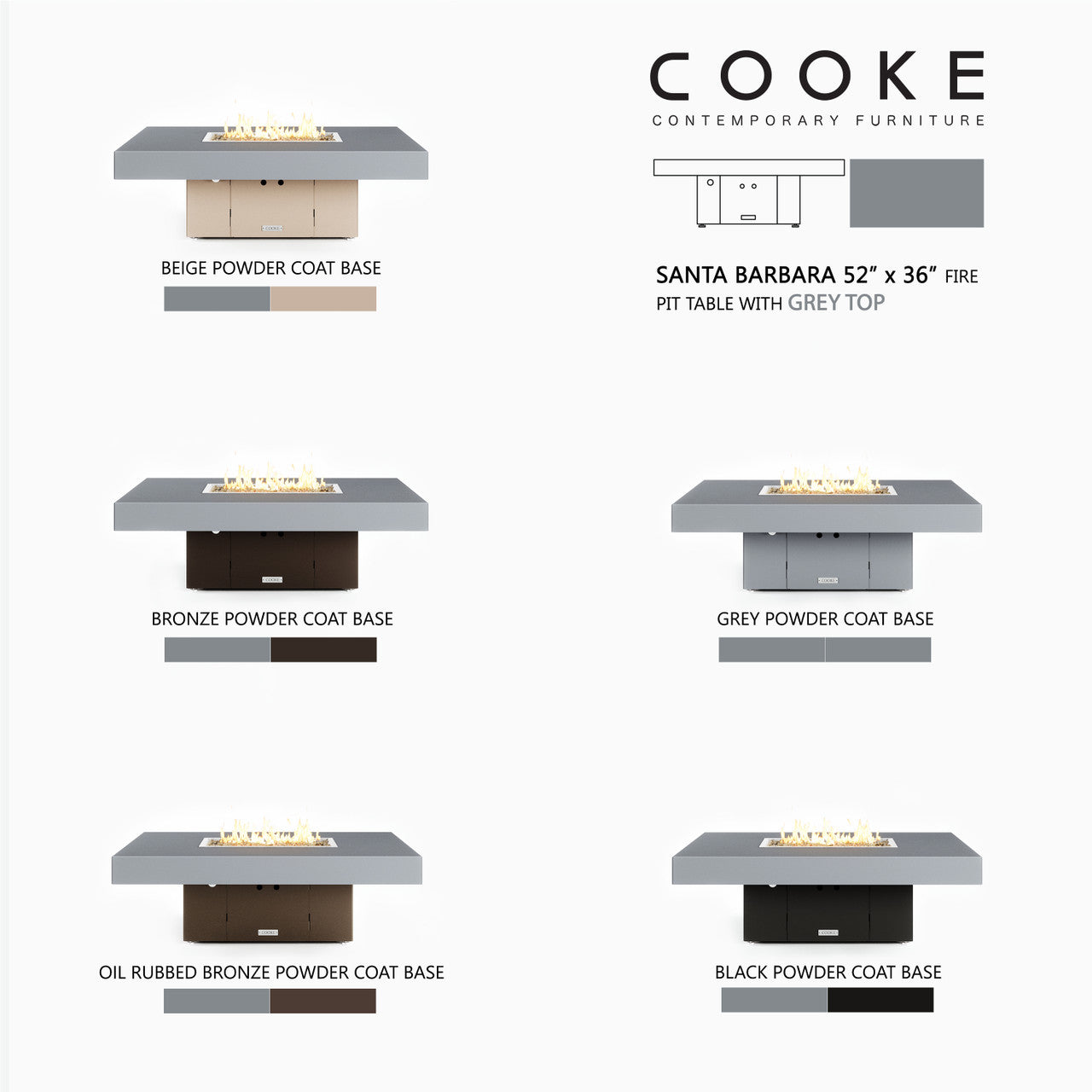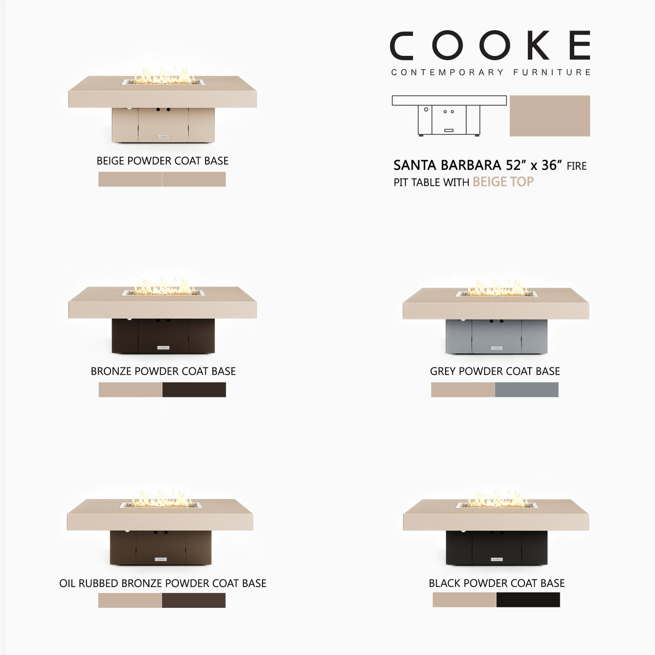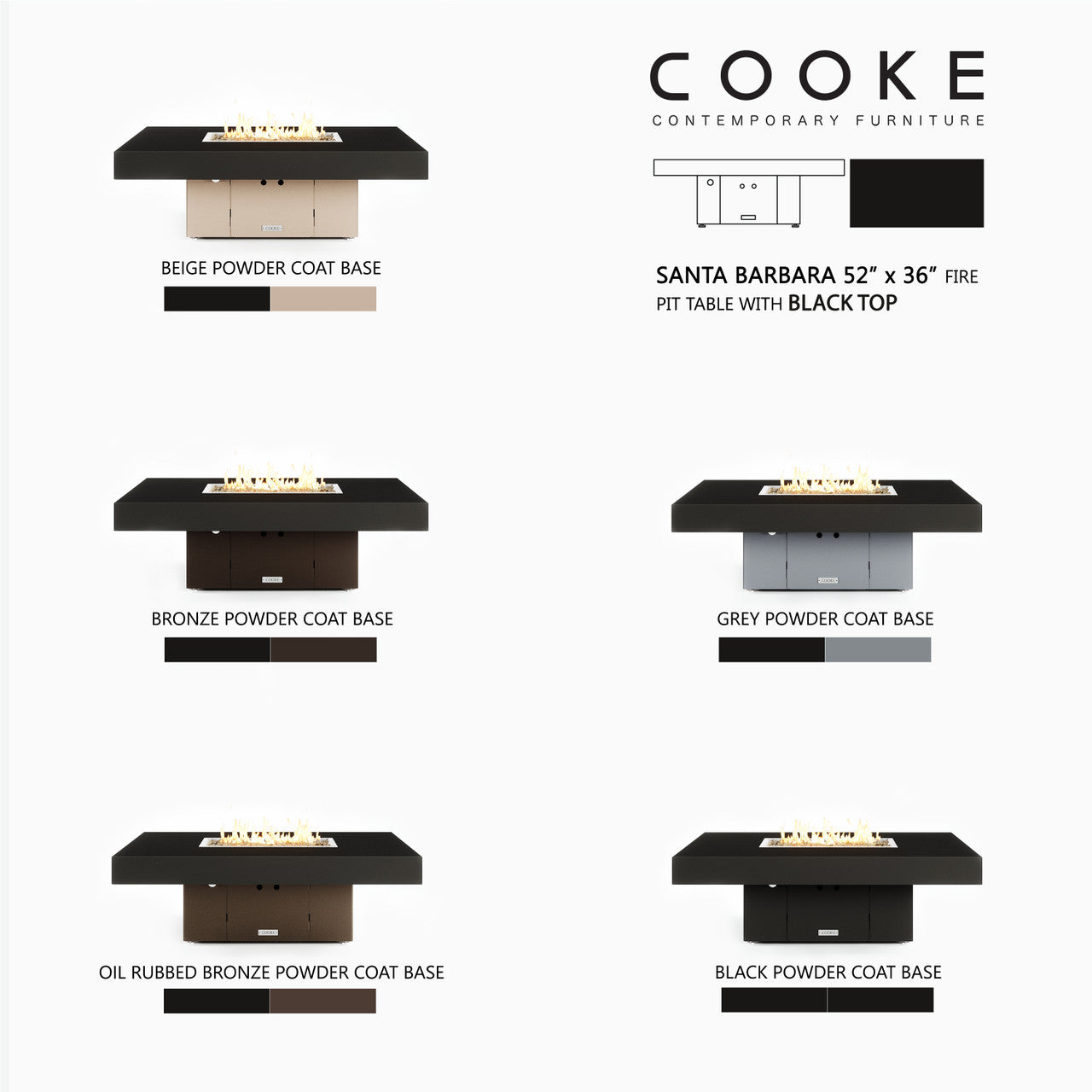 The Santa Barbara outdoor fire pit table is a contemporary masterpiece. The tabletop is beautifully cantilevered over a solid straight sided base. The table is available in a wide variety of color combinations. Perfect for your own courtyard, backyard, or garden sanctuary. Built with the same legendary Cooke durability, this table conveys and impression of permanence, tranquility, and comfort. Our customers love this table's stain resistant aluminum surface, adjustable leveling feet, and plenty of room for small plates and drinks. Cover up the burner and this table is a stylish and contemporary garden table.
