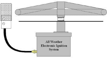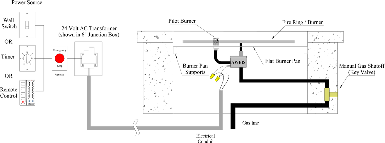 All Weather Electronic Ignition System - Standard Capacity AWEIS SC Please note that as of 2018 Fire by Design has improved their system with a new pilot head that has 2 separate pilot heads. The AWEIS SC is the smallest Electronic Ignition System for use in Fire Bowls and Fire Pits on the market today. Its small size, especially in height makes it the perfect match for those features that do not have much room in the vertical. With a maximum gas output of 290K Btu/hr – which is quite a large amount of gas - it can be used in most fire feature applications. For those features requiring even more gas we have the AWEIS High Capacity System.