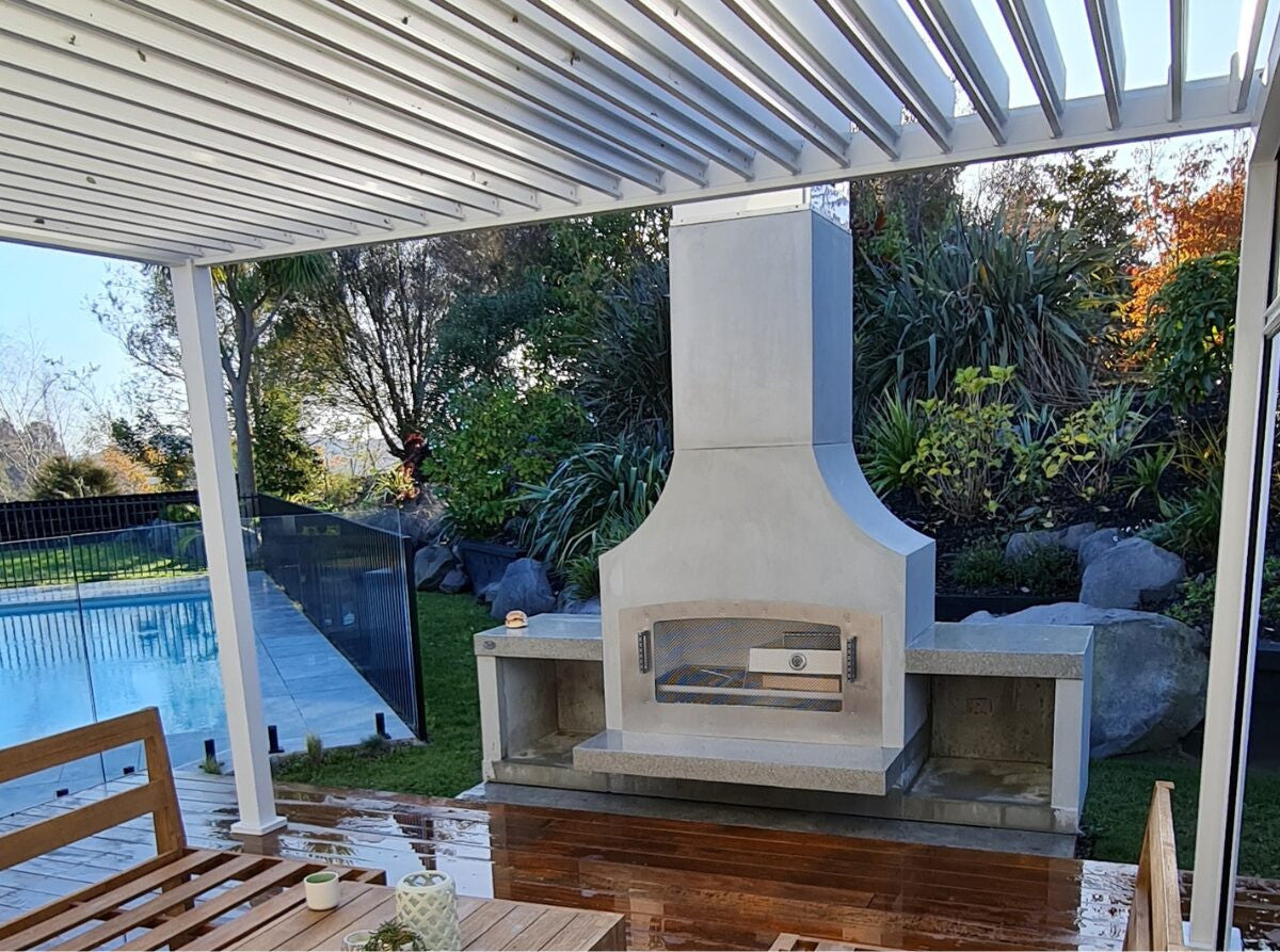 Flare’s Signature Series of Outdoor Fireplaces have been warming homes for over 20 years. They are designed around the principle of a wide mouth to allow for a big fire and simultaneous cooking over embers. Their masonry structure provides a heat-sink, whereby the entire fireplace radiates warmth and provides a secure structure that stands the test of time. In addition, Flare Fires are modifiable: Choose a chimney shape you like and the configuration of wood-storage that suits your space.